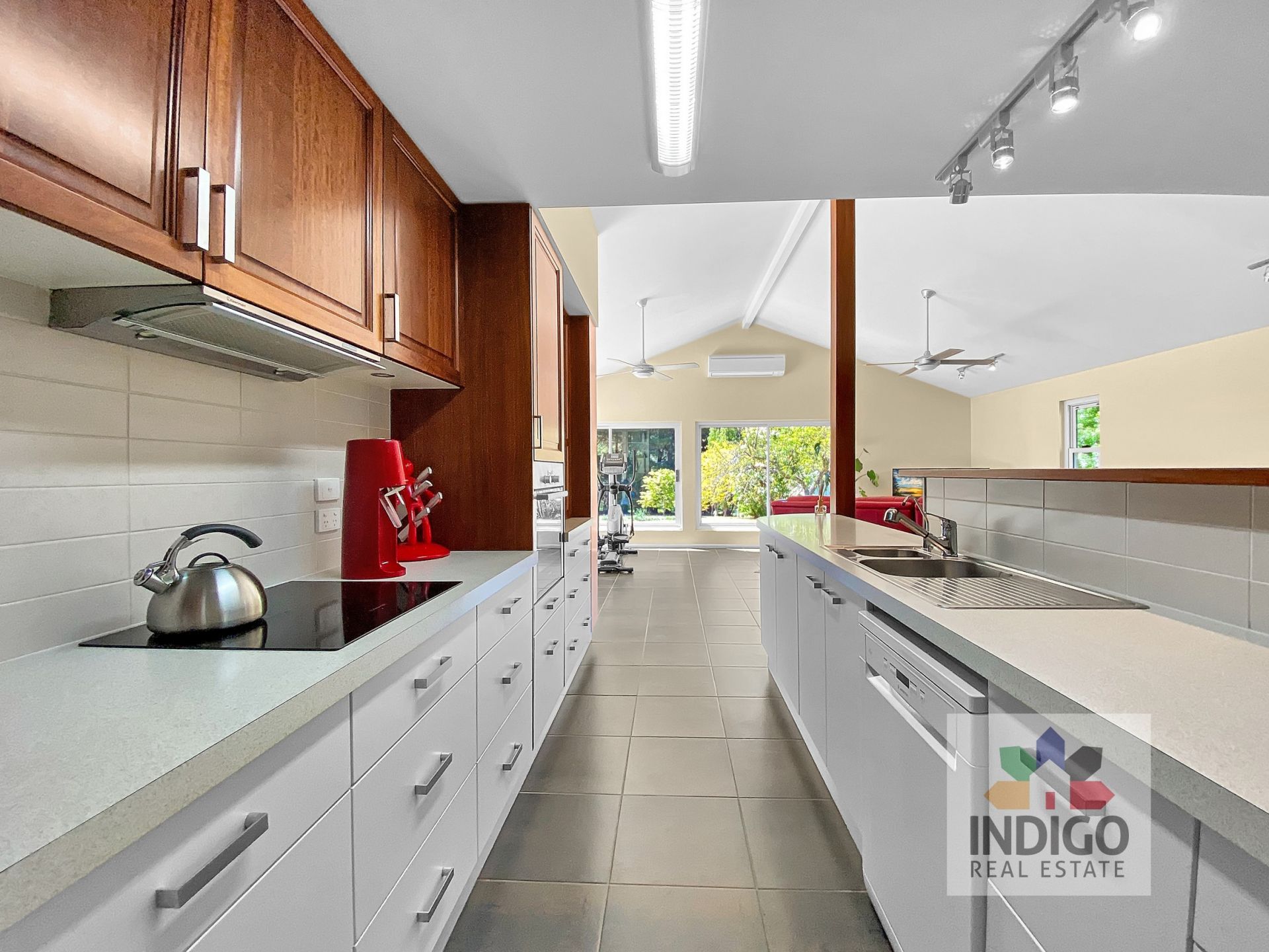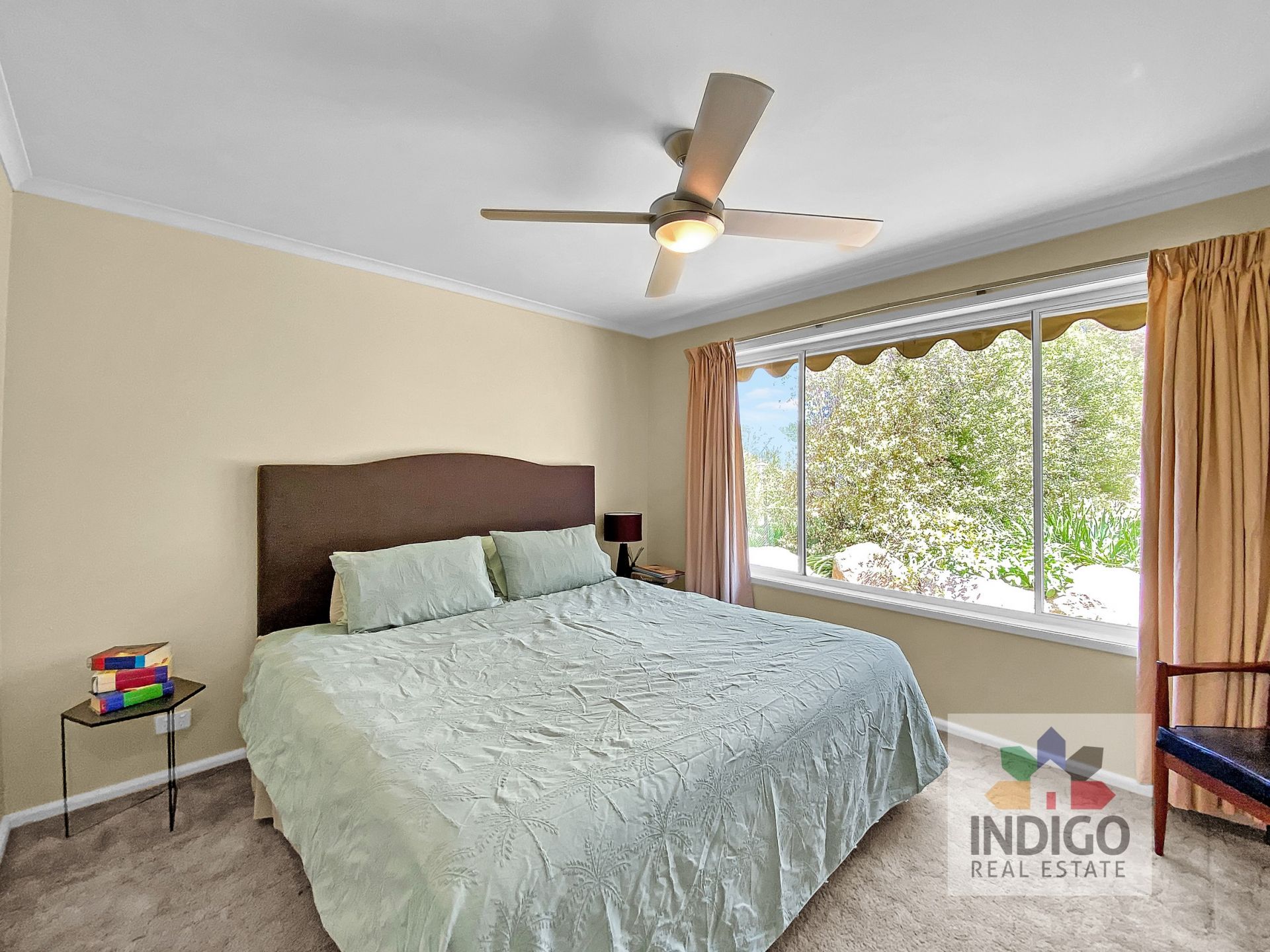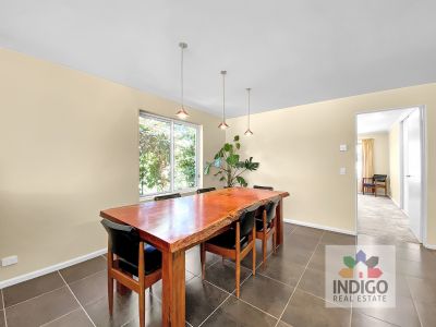 The open plan kitchen and living area is spacious, homely, light-filled, and welcoming, with views across the rear lawns and gardens that adjoin the Silver Creek reserve. The galley kitchen includes excellent storage, a utility cupboard, an electric oven, and cooktop, 1 ½ stainless-steel sink, and featured hardwoods. There is an adjacent meals and dining area.