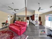 The open plan lounge is tiled and features high-pitched ceilings, extensive double-glazed windows, and views to the private rear lawns, featured partition stone wall, wood combustion heater with heat transference system to the bedrooms, reverse-cycle air-conditioner, ceiling fan, study nook, and rear door access leading to the large barn-style garage and workshop.