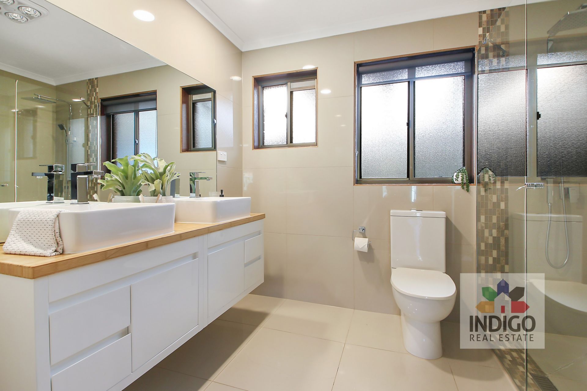 The main tiled bathroom features a double vanity, a large double shower, and a toilet. There is also a separate laundry with independent rear access.
