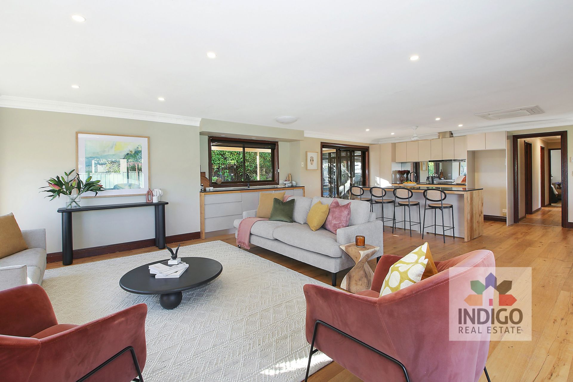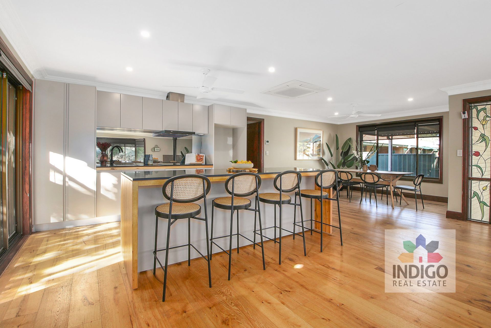 This recently renovated home features a wonderfully spacious and light-filled open plan living area incorporating a central kitchen with an electric oven and induction cooktop, stainless steel sink, mobile island bench, breakfast bar, stone tops, excellent meals preparation areas, an abundance of storage, soft-close drawers, dining area with a ceiling fan, and sliding doors to the gardens, and an enclosed, heated swimming pool. The adjacent lounge is also generously sized and includes a wood combustion heater.