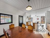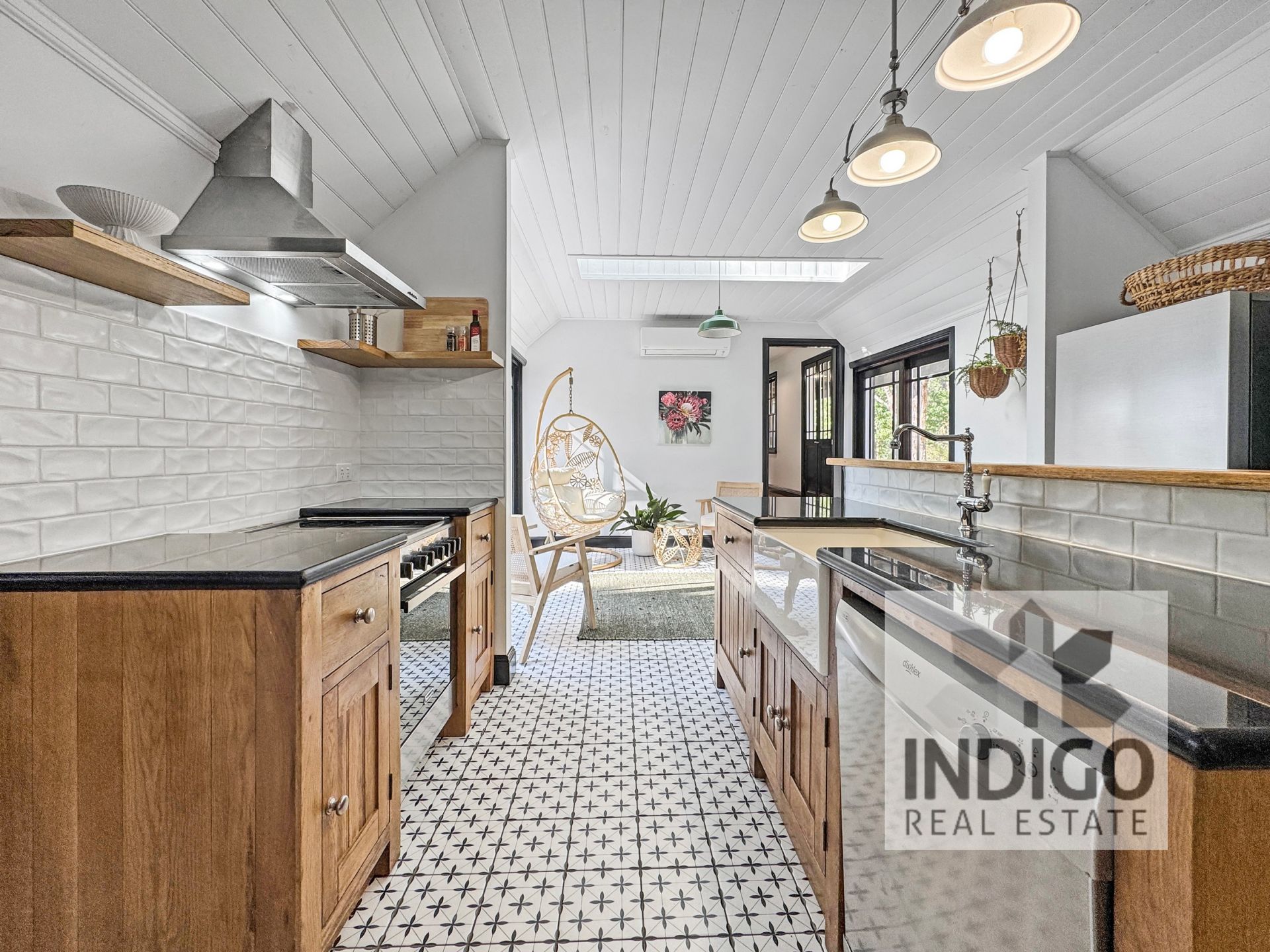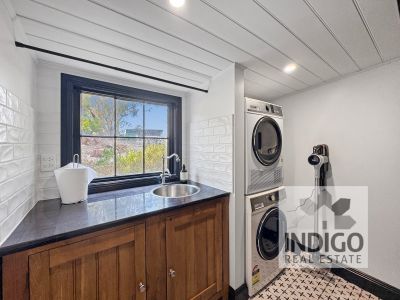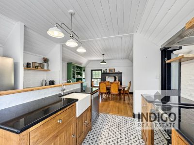 The open-plan living area features a country-style kitchen with electric cooking, a dishwasher, a large sink, plenty of storage, and a cozy coffee nook. It seamlessly connects to a combined butler's pantry/laundry with an additional sink and further storage. Adjacent to the kitchen, the dining area is complemented by a wood-fired stove (not in use), and the sun-filled lounge area boasts a skylight, reverse-cycle air conditioning, and easy access to both the front and rear gardens.