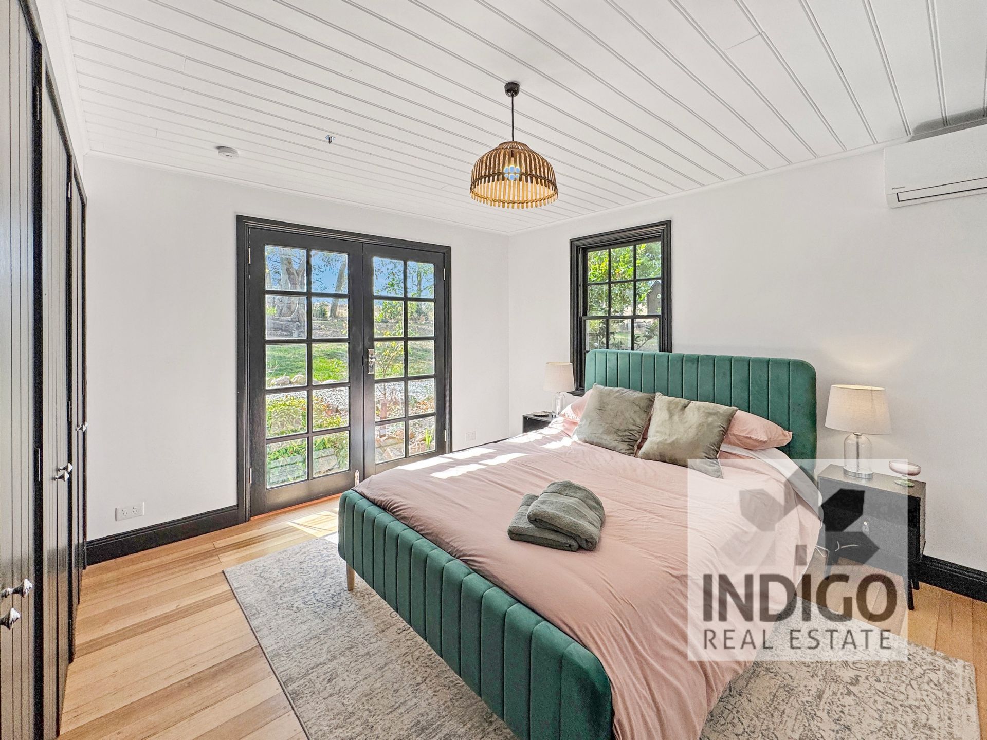 The spacious king-sized master bedroom includes built-in robes, reverse-cycle air conditioning, polished timber floors, and French doors that open to the peaceful rear gardens. Upstairs, two additional generously sized queen bedrooms, both carpeted, come with built-in robes, independent reverse-cycle air conditioning, and elevated views of the surrounding property.