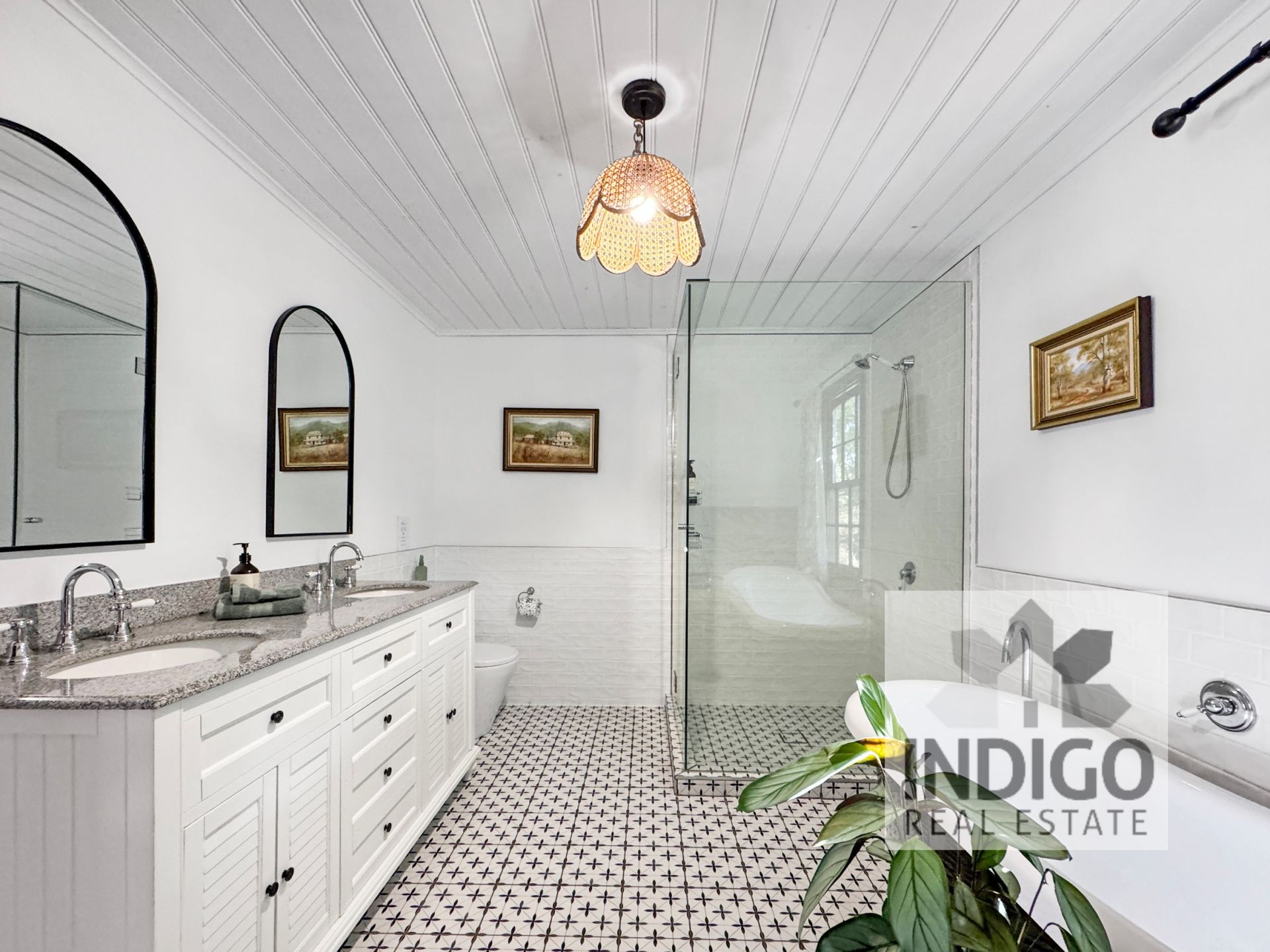 The modern tiled bathroom is spacious and includes a large shower, a freestanding claw-foot bath, a vanity with double basins, and a separate toilet.