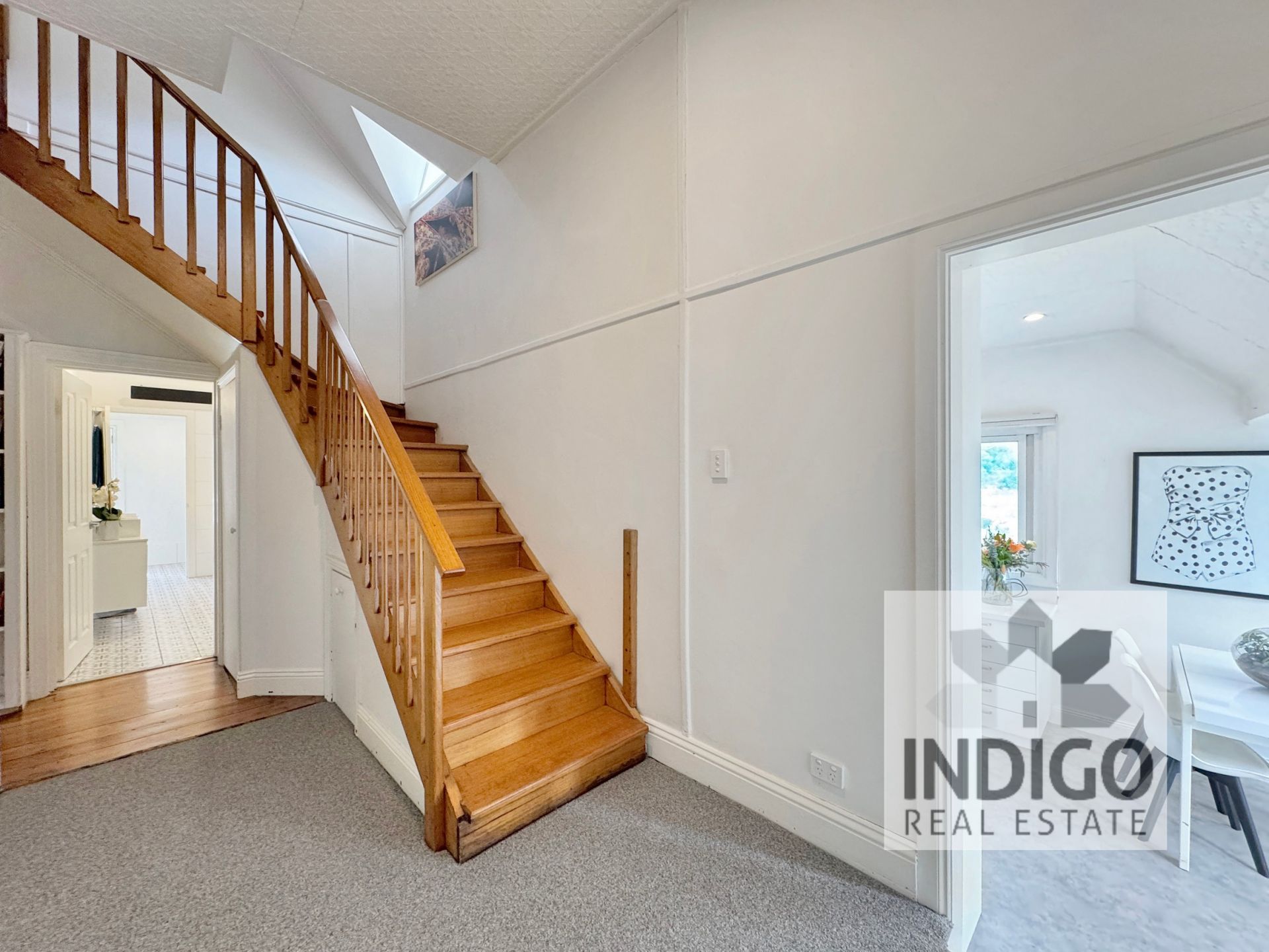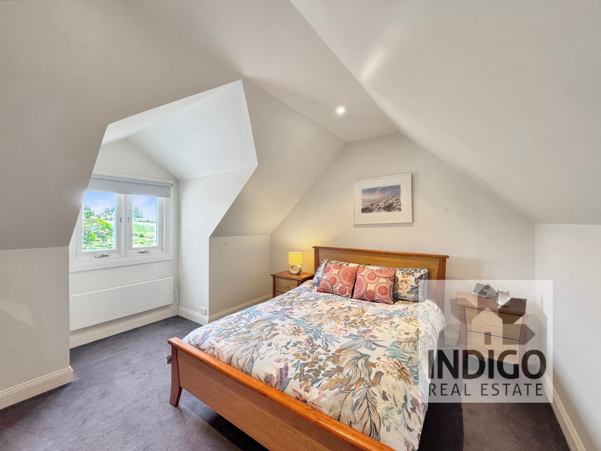 The king-sized main bedroom is a private retreat complete with reverse-cycle air-conditioning. French doors open to the front verandah with its graceful concave roofline, and a walk-in robe adjoining a tiled ensuite with stone benchtop vanity, walk-in shower, and toilet. Three additional queen-sized bedrooms – two upstairs and one on the lower level – each feature carpet and built-in storage, with the downstairs bedroom opening to the front verandah via French doors.