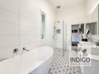 The main bathroom reflects the same attention to quality, offering a freestanding bath, large walk-in shower, double stone-topped vanity, wall heater, and a separate toilet. A generous laundry provides ample storage and direct access to the side deck and yard.