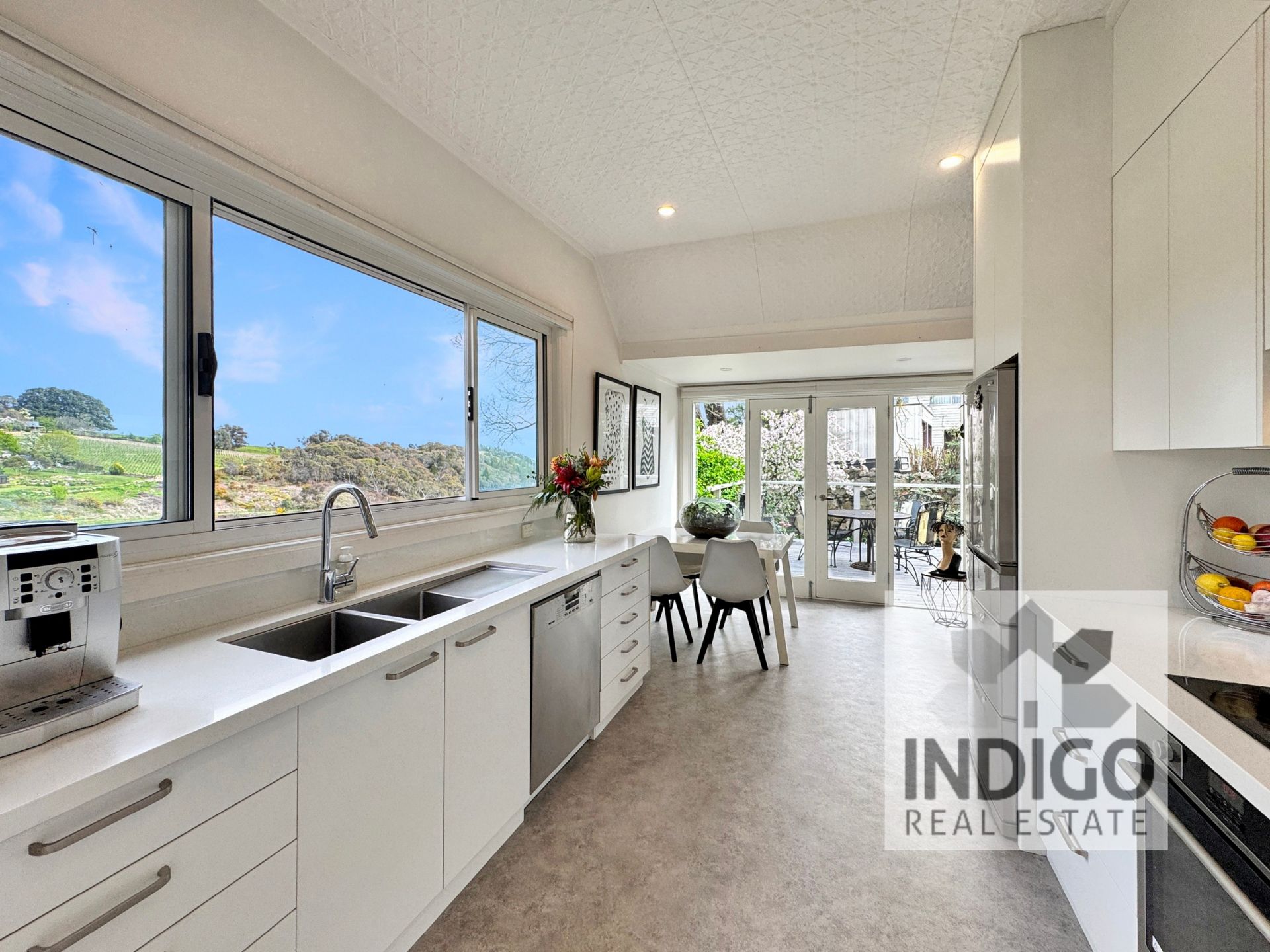 The contemporary kitchen is bright, airy, and perfectly positioned to continue the connection with the Gorge views. It features stone benchtops, an AEG induction cooktop, Pyrolytic oven, soft-close drawers, Miele dishwasher, and a decorative pressed metal ceiling that adds a touch of heritage charm.