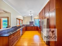 The adjacent lounge includes a high ceiling, Baltic pine floors, a built-in TV cabinet and storage, and a timber-lined ceiling. The dining and meals area offers a ceiling fan, split-system air-conditioning and dual French doors opening to the undercover deck overlooking the easy-care gardens, and perfect for year-round entertaining. There is also a separate sitting area with a ceiling fan and cosy wood combustion heater, and access to a home office or a potential fifth bedroom.