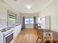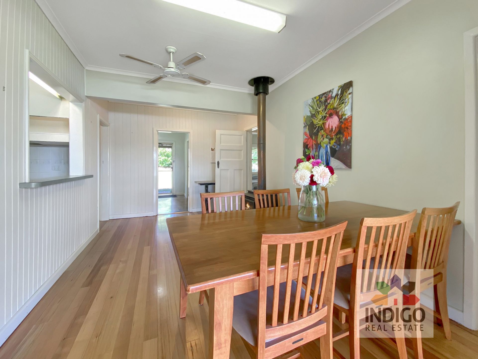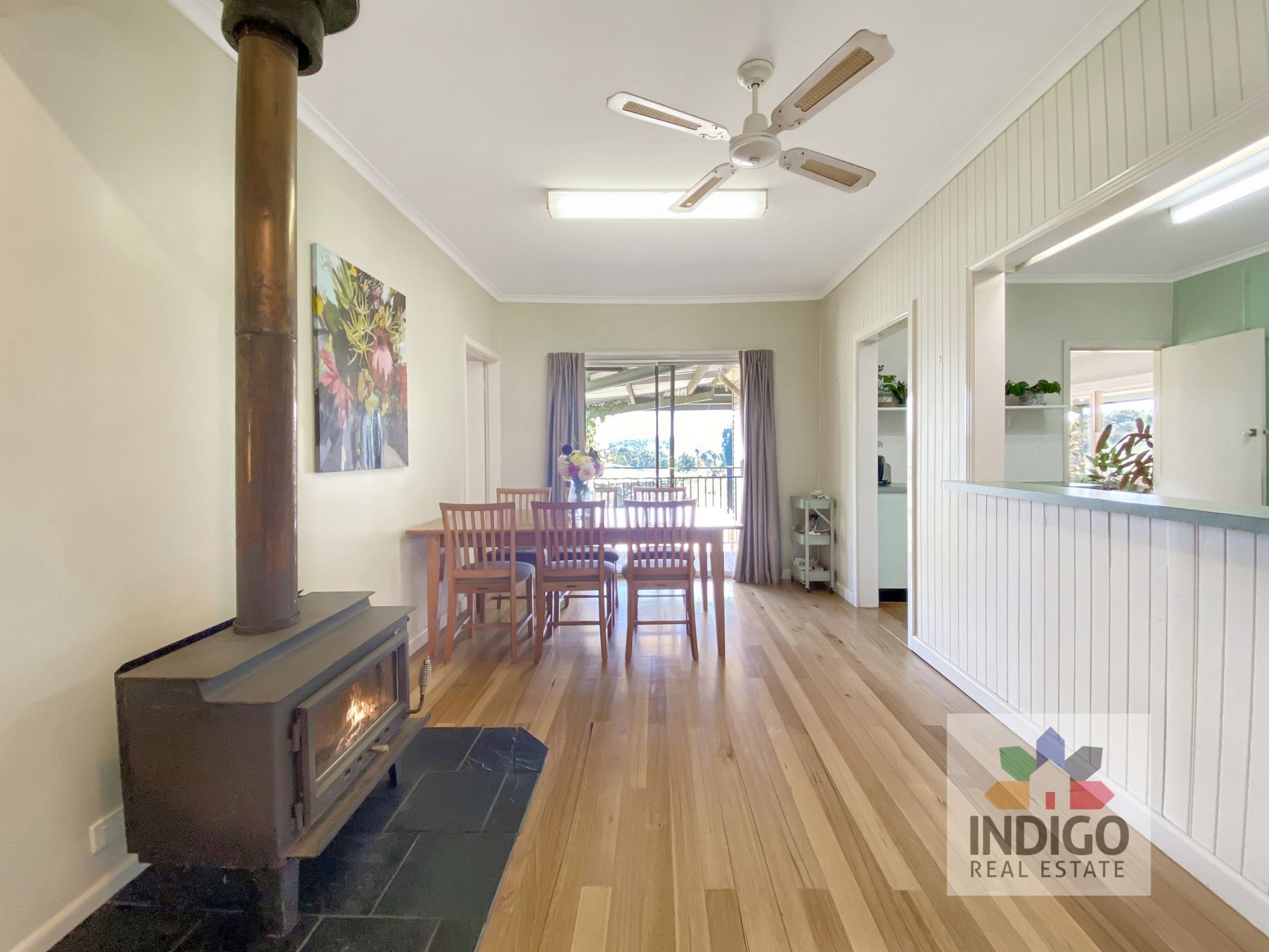 The centrally located kitchen includes a gas oven and cooktop, stainless-steel sink, good storage, and walk-through access to a formal meals area with a Nectre wood combustion heater, ceiling fan, and sliding doors to a small step-out. The north-facing lounge offers extensive views across the property and the distant ranges, reverse-cycle air-conditioning, ceiling fan, and sliding doors to another small step-out.