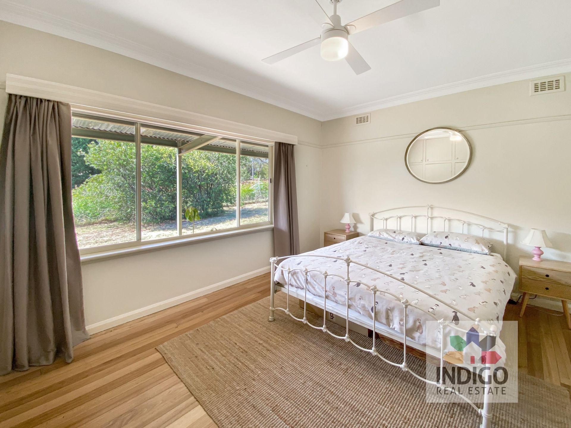 The eastern wing of this home features a king-size main bedroom with a ceiling fan, built-in robes, views to the gardens, and an adjacent queen-size bedroom with built-in- robes.